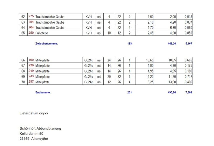 Holzlisten werden nach Kundenwunsch sortiert wie z.B. nach Breite, Stärke, Länge und Schnittklasse. Ferner können Zwischensummen ausgewiesen werden, um eine genaue Abrechnung der Hölzer zu erhalten.